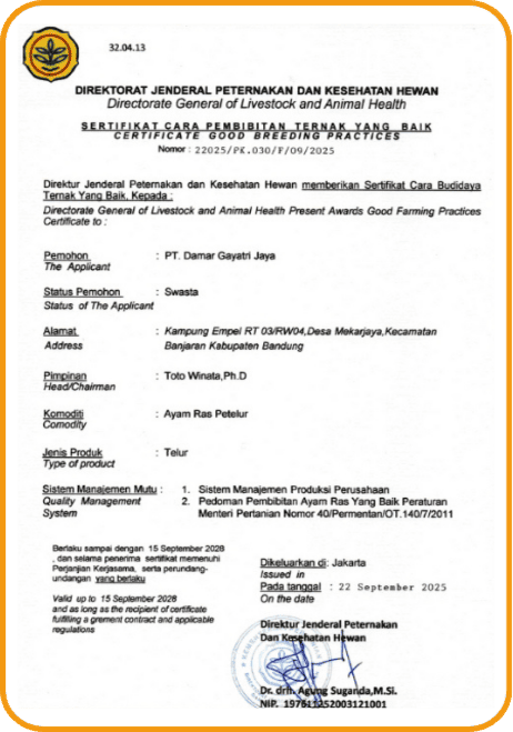 Memperoleh Sertifikat Cara Pembibitan Ternak yang Baik dari Direktorat Jenderal Peternakan & Kesehatan Hewan, Kementerian Pertanian Republik Indonesia (2025)
