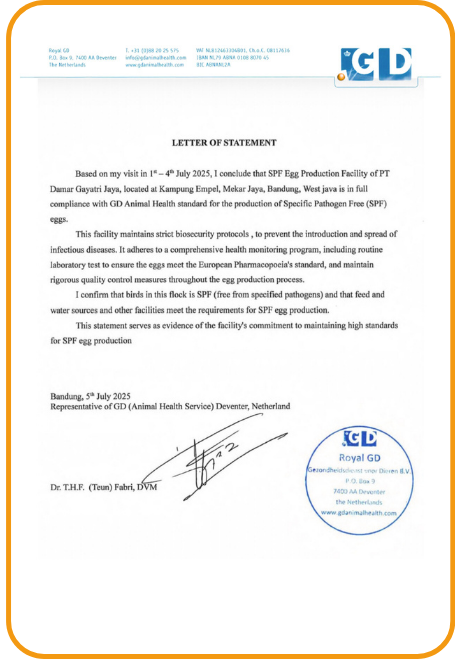 Memperoleh Letter of Statement dari Royal GD Animal Health, mengakui Fasilitas Produksi Telur SPF PT DGJ Berstandar Internasional (2025)